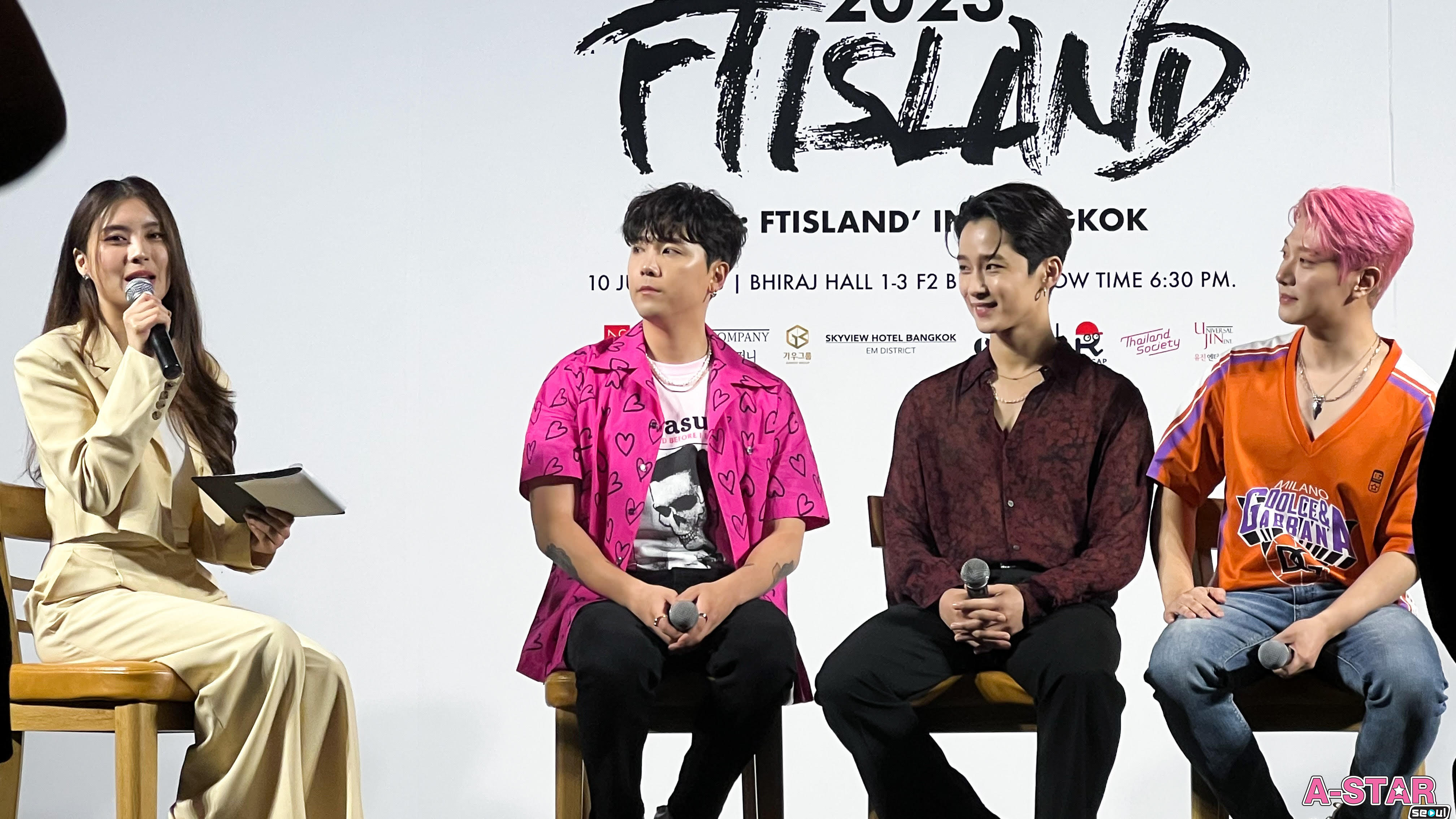 ซึ่งงานแถลงข่าวในวันนี้ก็ได้น้องแพร เอ็มซีคนสวยควบหน้าที่พิธีกรและล่ามในงานแถลงข่าว "2023 FTISLAND LIVE 'RE : FTISLAND' IN BANGKOK" และในเวลาประมาณ 16.30 น. ก็ได้เวลาที่ 3 หนุ่มจะขึ้นเวทีมาทักทายพี่ๆ สื่อมวลชนและแขกในงานวันนี้ "สวัสดีครับ พวกเรา FTISLAND ครับ" จากนั้นก็ทักทายเป็นรายคนเริ่มจากฮงกิ "สวัสดีครับ ผมอี ฮงกิครับ" ส่วนแจจินทักทายเป็นภาษาไทยแบบกันเองว่า "แจจิน ครับ" เช่นเดียวกับมินฮวานที่ทักทายในสไตล์ที่คุ้นเคย "สวัสดีครับ มินฮวานครับ" จากนั้นจึงเผยความรู้สึกของการได้มาเล่นคอนเสิร์ตในไทยในรอบ 5 ปี ซึ่งหนุ่มฮงกิเป็นตัวแทนบอกว่า ตัวเองนั้นชอบประเทศไทยมากๆ ถึงแม้รอบนี้จะเป็นการมาคอนเสิร์ต แต่ก่อนหน้านี้อย่างปีที่แล้วก็มาเที่ยวประเทศไทยหลายๆ รอบ แล้วครั้งนี้หลังจากจบคอนเสิร์ตก็จะเที่ยวไทยต่ออีก รักประเทศไทยมากๆ รู้สึกว่าอยากจะขึ้นคอนเสิร์ตอยากจะเจอแฟนๆ เร็วๆ แล้ว