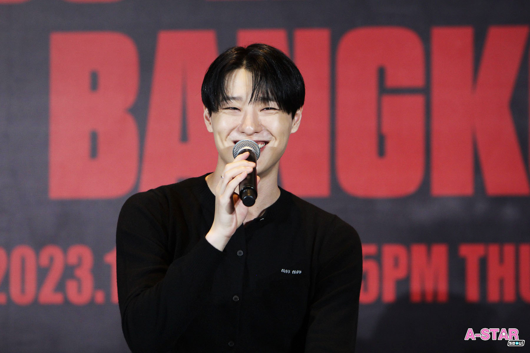และในฐานะที่ WOODZ มาประเทศไทยหลายครั้ง เลยอยากจะให้มีคำภาษาไทยพิเศษๆ พูดกับแฟนๆ ชาวไทยหน่อย ซึ่งเจ้าตัวก็ถามแฟนๆ ว่า อยากได้ยินคำไหนอ่ะ มีมู้ดจึในห้องแถลงข่าวบอกว่าอยากได้ยินคำว่ารัก เจ้าตัวเลยสวนกลับไปทันควันเป็นภาษาไทยว่า "ผมรักคุณ" (กรี๊ดสิคะ รออะไร) โดยที่เอ็มซียังได้เตรียมประโยคสุดจึ้งมาให้ WOODZ ด้วยนั่นก็คือ "คนที่หล่อขนาดนี้ เป็นของคุณนะ" และขอโทนเสียงในแนวอบอุ่นๆ เซ็กซี่ๆ อีกต่างหาก ซึ่งเจ้าตัวก็ไม่ขัดความประสงค์ จัดให้ตามต้องการ "คนที่หล่อขนาดนี้ เป็นของคุณนะ" กรี๊ดกันกระจายแล้ว ในช่วงท้ายหนุ่ม WOODZ ก็ขออวยพรวันคริสต์มาสและปีใหม่ล่วงหน้าที่ทำเอาเหล่ามู้ดจึถึงกับน้ำตาซึม "ปี 2023 เหลือแค่ไม่กี่วันแล้ว ปีหน้า 2024 ก็อยากให้ทุกๆ คนสมหวัง มีแต่เรื่องดีๆ มีแต่ความสุขและก็อยากให้ทุกคนรักษาสุขภาพ และก็อย่างที่ทุกท่านทราบ พวกเราก็อาจจะไม่ได้เจอกันสักพักนึงใช่มั้ยครับ (ไปเข้ากรม) ผมก็จะเต็มที่กับทุกๆ อย่าง ทุกๆ งานที่ผมจะได้ทำในปีหน้า อยากให้ทุกคนรักษาสุขภาพและดูแลตัวเองด้วย" และเจ้าตัวก็ไม่พลาดที่จะอวยพรเป็นภาษาไทยว่า "ขอให้มีความสุขในวันคริสต์มาสและปีใหม่นี้ครับ" โดยหนุ่ม WOODZ พูดตามเอ็มซีทีละท่อนเลยโดนเอ็มซีนุ้ยอำว่า อูจึ เป็นคนที่ความจำดีมากเลย อยากให้พูดทั้งประโยคใหม่อีกครั้งนึง ซึ่งเจ้าตัวก็พูดกลับมาว่า "Merry Chirstmas" แบบว่าหัวไว ตบมุขกลับได้ทันควัน 555
