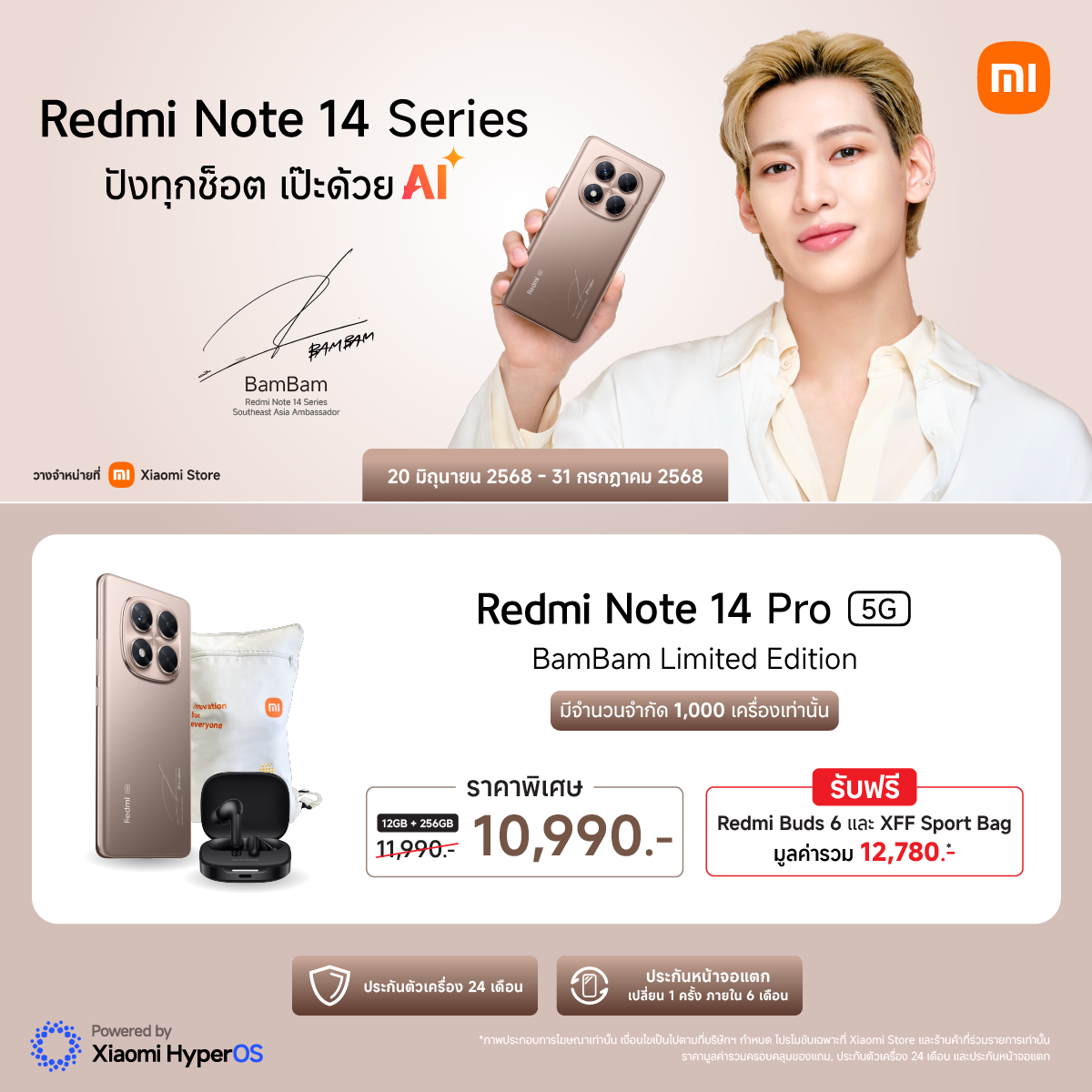 สมาร์ทโฟน Redmi Note 14 Pro 5G BamBam Limited Edition วางจำหน่ายแล้ววันนี้ในราคาพิเศษ 10,990 บาท (จากราคาปกติ 11,990 บาท) ที่ Xiaomi Store เท่านั้น สำหรับ Redmi Note 14 Series รุ่นต่างๆ วางจำหน่ายแล้วที่ Xiaomi Store, ร้านตัวแทนจำหน่ายที่ร่วมรายการ และช่องทางออนไลน์แพลตฟอร์ม mi.com, Lazada, Shopee และ TikTok Shop
