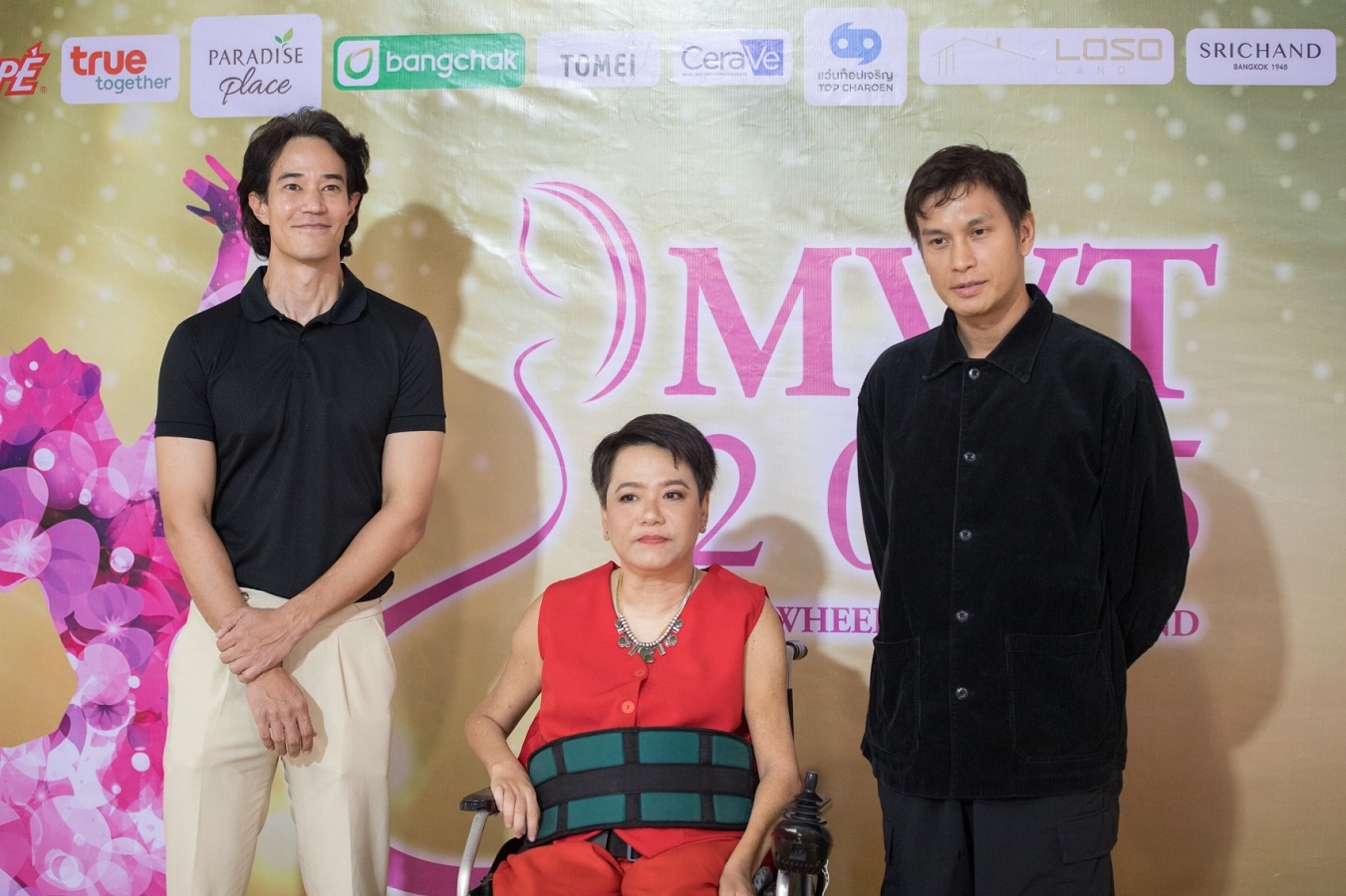 จากซ้ายไปขวา : เจฟฟรี เบญจกุล, เพชรน้ำหนึ่ง ศรีวรรธนะ ผู้อำนวยการกองประกวดมิสวีลแชร์ไทยแลนด์, โอ อนุชิต สพันธุ์พงษ์