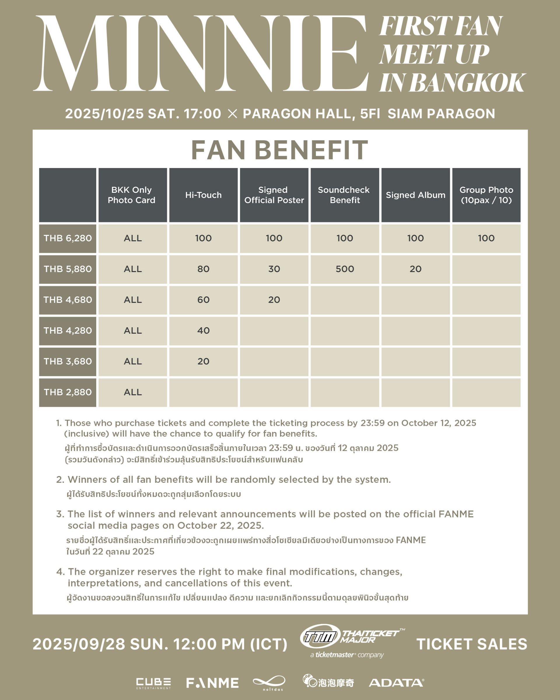 งานนี้เปิดจำหน่ายบัตรวันอาทิตย์ที่ 28 กันยายน 2568 เวลา 12.00 น. เป็นต้นไป ทาง www.thaiticketmajor.com ราคาบัตร 6,280 / 5,880 / 4,680 / 4,280 / 3,680 และ 2,880 บาท ลุ้นรับเบเนฟิต อาทิ Thailand Exclusive Photo Card , i-Touch, Signed Poster, Soundcheck, Signed Album และ Group Photo สามารถติดตามรายละเอียดเพิ่มเติมได้ที่ IG: fanme.official / FB:FANME และ X:@official_fanme