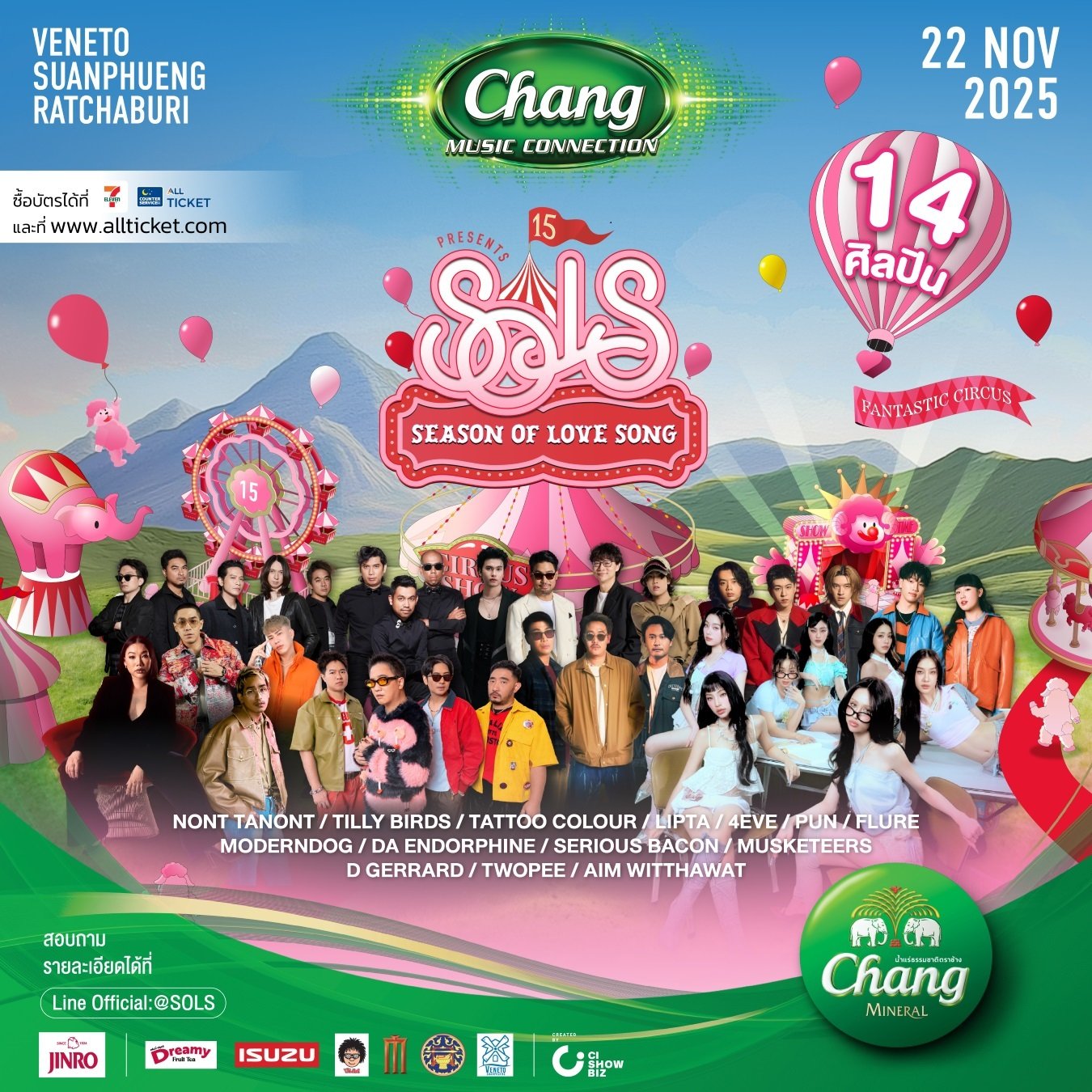 กลับมาอีกครั้งกับเทศกาลดนตรีที่แฟนเพลงตั้งตารอคอย Chang Music Connection presents Season of Love Song ครั้งที่ 15 โดยผู้จัด CI SHOWBIZ ปีนี้มาพร้อมคอนเซ็ปต์ใหม่ Fantastic Circus เนรมิตเวทีคอนเสิร์ตกลางธรรมชาติให้กลายเป็นคาร์นิวัลแห่งเสียงดนตรี อัดแน่นด้วยโชว์ต่อเนื่องยาวที่สุดในประเทศไทยกว่า 15 ชั่วโมงเต็ม ฟินยันเช้า ในวันเสาร์ที่ 22 พฤศจิกายน 2568 ณ เวเนโต้ อ.สวนผึ้ง จ.ราชบุรี