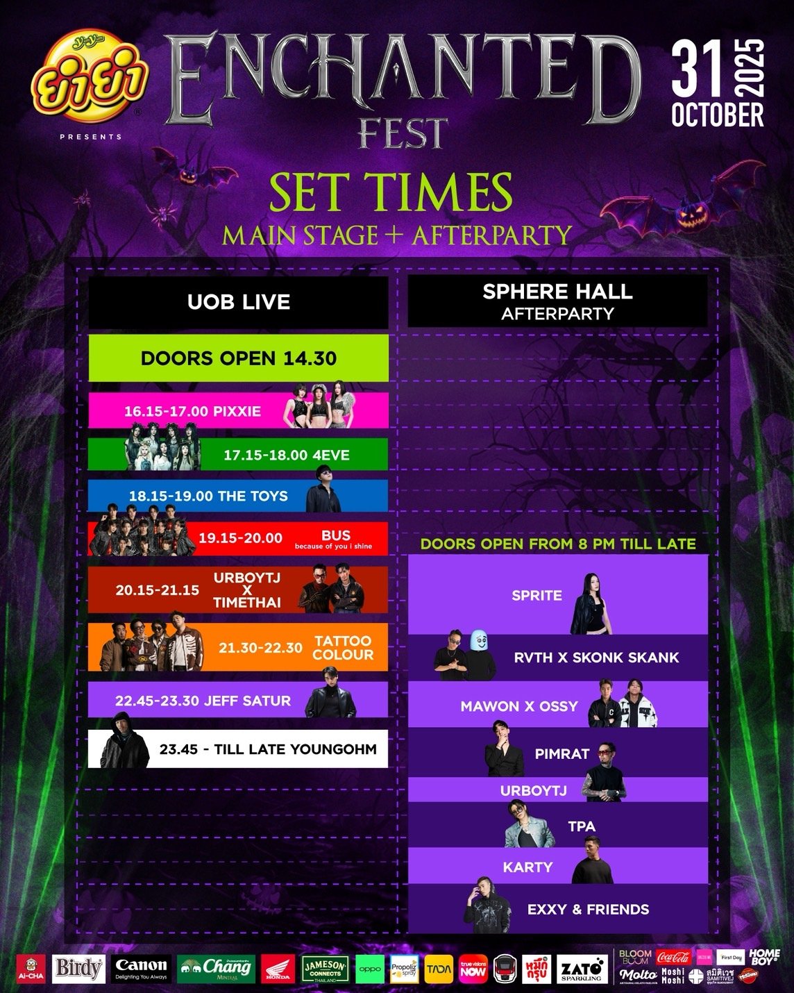 พร้อมกันรึยังกับโค้งสุดท้ายที่จะมาปลดปล่อยวิญญาณความมันส์ในงาน YUMYUM presents ENCHANTED FEST 2025 (ยำยำ พรีเซ็นต์ เอ็นแช้นเท็ด เฟส 2025) โดย Enchanted VIP (เอ็นแช้นเท็ด วีไอพี) นำทีมโดย นายชาร์ล โรเบิร์ต Head Project Director กับฮาโลวีนมิวสิกเฟสติวัลสุดยิ่งใหญ่ใจกลางเมืองที่ทุกคนรอคอย ที่จะพาทุกคนเข้าสู่ความมันส์แห่งโลก ENCHANTED WORLD ในค่ำคืนวันฮาโลวีนอย่างแท้จริง จัดเต็ม 2 เวที 2 สไตล์ ในวันเดียวกัน เอาใจทุกทาร์เกตทั้งสายคอนเสิร์ต ณ UOB LIVE at EMSPHERE กับไลน์อัพศิลปินตัวท็อปของไทย ได้แก่ BUS because of you i shine, JEFF SATUR, TATTOO COLOUR, 4EVE, THE TOYS, PIXXIE, URBOYTJ x TIMETHAI และ YOUNGOHM ซึ่งในปีนี้นอกจาก ENCHANTER ทุกคนจะได้พบกับพลังการโชว์แบบ DUO ครั้งแรกจาก URBOYTJ x TIMETHAI แล้ว ยังมีอีกความพิเศษที่ทุกคนพลาดไม่ได้กับเซอร์ไพร์สโชว์จาก BUS because of you i shine ที่บอกเลยว่ามีแค่บนเวที ENCHANTED FEST 2025 เท่านั้น!! ส่วนสายปาร์ตี้ ห้ามพลาด กับเวที “ENCHANTED FEST 2025 OFFICIAL AFTERPARTY” SPHERE HALL at EMSPHERE กับไลน์อัพ DJ Set ที่จัดมาแบบเน้นๆ ไม่ว่าจะเป็น TPA, DJ KARTY, DJ SPRITE, DJ EXXY, DJ Mawon x DJ OSSY และ DJ RVTH x MC SKONK SKANK โดยฮอลล์นี้มีแขกรับเชิญสุดพิเศษที่มาอัพเลเวลความเดือดอย่าง URBOYTJ ที่พร้อมทุ่มสุดตัวเสิร์ฟความมันให้แฟนๆ ทั้ง 2 สาย อีกทั้งยังจัดเซอร์ไพรส์ให้กับโชว์ฮาโลวันเซ็ตใหม่ล่าสุดสำหรับ ENCHANTER สายปาร์ตี้ทุกคนอีกด้วย