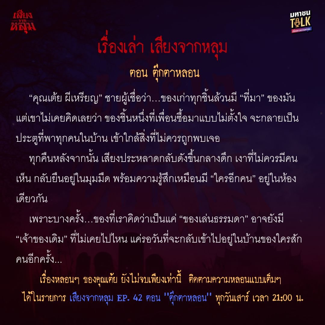 เรื่องหลอนๆ ของ คุณเต้ย ยังไม่จบเพียงเท่านี้ ติดตามเต็มๆ ได้ใน ตอน “ตุ๊กตาหลอน” ในรายการ เสียงจากหลุม ในวันเสาร์ที่ 6 ธันวาคมนี้ เวลา 21.00 น. เป็นต้นไป ทาง YouTube Ch7HD : https://bit.ly/ytsiangchaklum