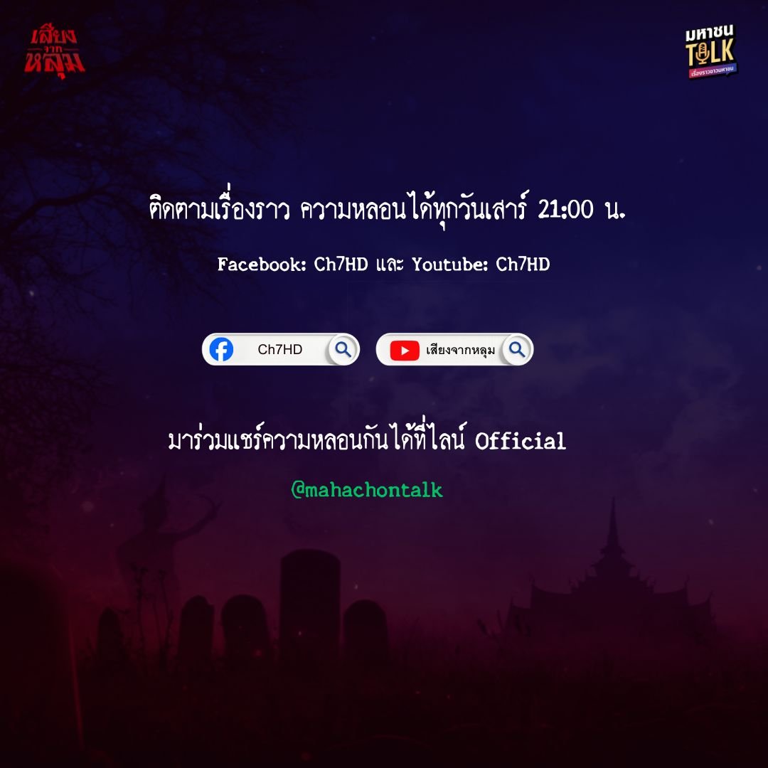 ส่วนใครที่มีเรื่องราวสยองขวัญที่อยากมาแชร์ สามารถแอดไลน์มาเล่าได้ที่ @mahachontalk พบกับรายการพอดแคสต์ “เสียงจากหลุม” โปรเจ็กต์ มหาชนTalk อัปเดตอีพีใหม่ ทุกวันเสาร์ เวลา 21.00 น. ทาง YouTube, Facebook : Ch7HD และเว็บไซต์ BUGABOO.TV