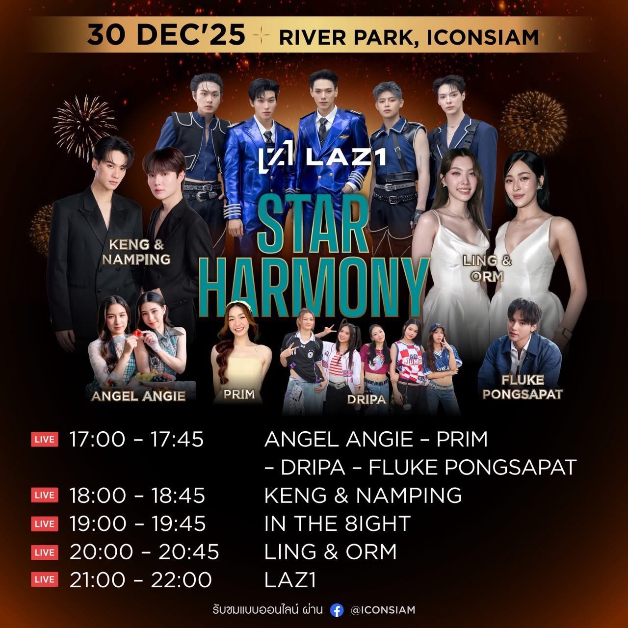 - วันที่ 30 ธันวาคม 2568 | STAR HARMONY โมเมนต์ความประทับใจของการกลับมารวมตัวของศิลปิน LAZ1 การแสดงสุดเอ็กซ์คลูซีฟจาก หลิง-ออม เคมีสุดละมุนของ เก่ง-น้ำปิง พร้อมเซอร์ไพรส์จาก Angel Angie, Prim, DRIPA, Fluke Pongsapat และ In The 8ight