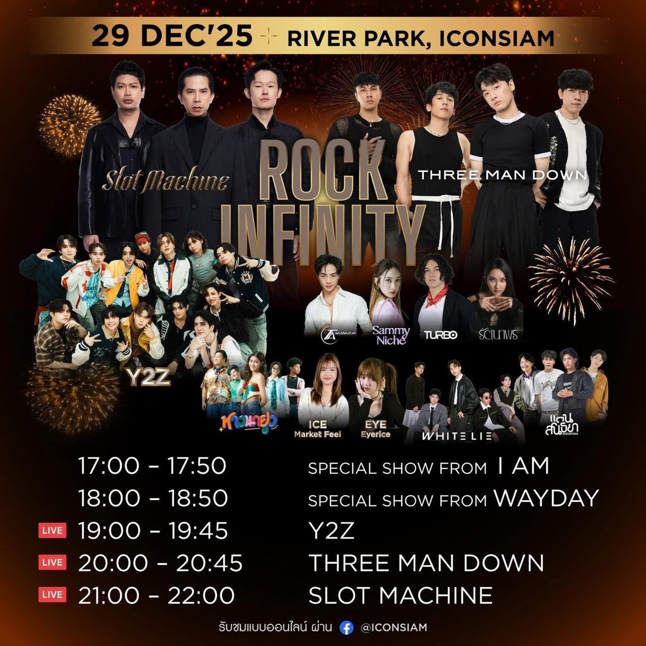 - วันที่ 29 ธันวาคม 2568 | ROCK INFINITY พลังแห่งร็อกที่เต็มไปด้วยความรักในเสียงดนตรี นำโดย Slot Machine, Three Man Down, Y2Z พร้อมศิลปินจาก IAM และ WAYDAY