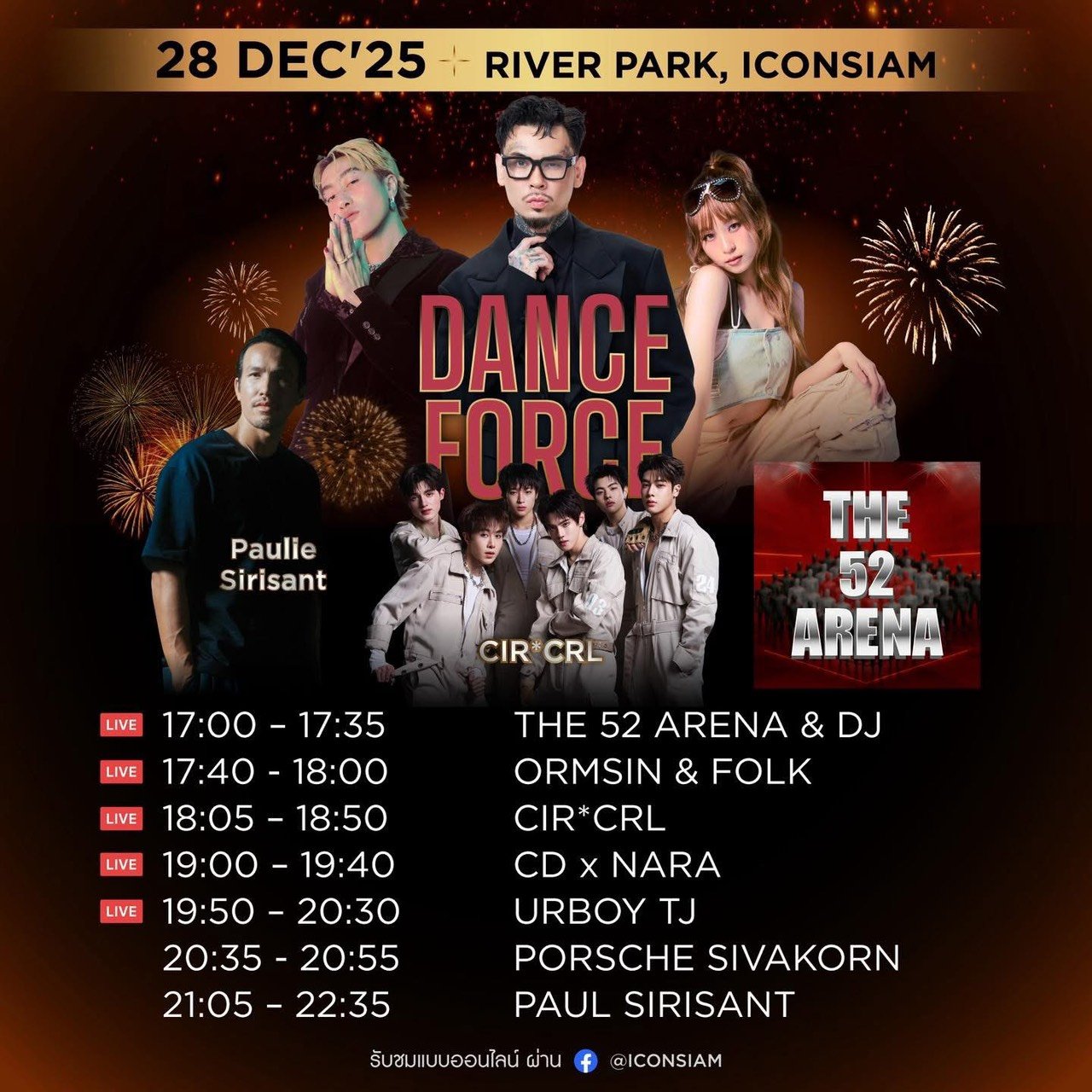 - วันที่ 28 ธันวาคม 2568 | DANCE FORCE รวมพลังทุกเจเนอเรชัน ร้อง เต้นให้สุดบน Riverfront Dance Arena ฟลอร์เต้นรำที่ใหญ่ที่สุดริมเจ้าพระยา ปล่อยพลังความมันจาก URBOYTJ, CDGUNTEE & NARA, ออมสิน- โฟล์ค, CIR*CRL, THE 52 ARENA, ปอร์เช่ ศิวกร และ Paulie Sirisant (DJ)