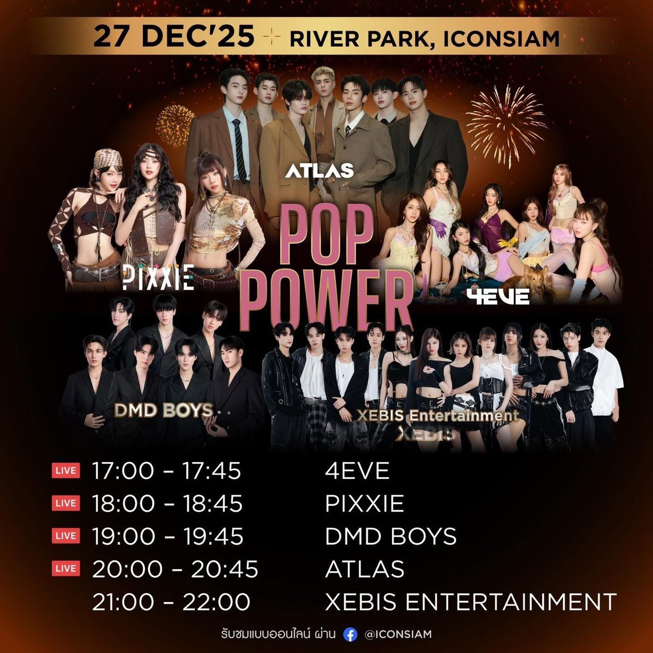 - วันที่ 27 ธันวาคม 2568 | POP POWER พลังแห่งความป็อปที่ส่งต่อความสุขให้ Pop Up ในทุกจังหวะ นำโดย PiXXiE, 4EVE, ATLAS, DMD BOYS และศิลปินจาก XEBIS Entertainment