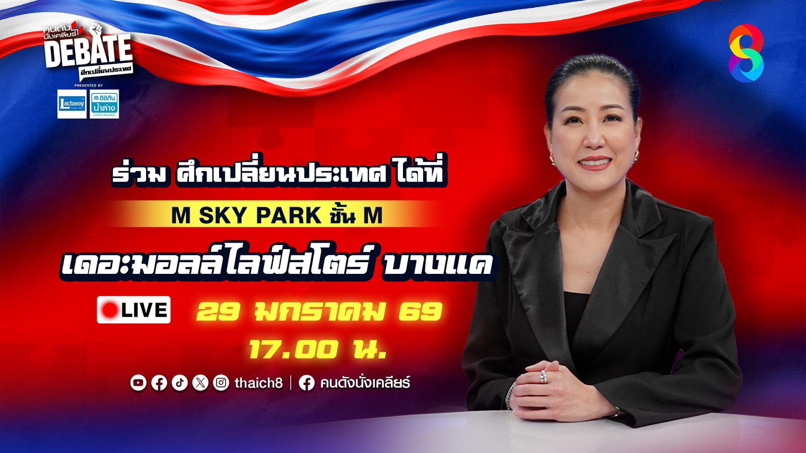 การดีเบตครั้งนี้จะมุ่งเน้นการ “ถามแทนใจชาวบ้าน” และ “เคลียร์นโยบายสดๆ บนเวที” ด้วยบรรยากาศที่ดุเดือดและตรงไปตรงมา เพื่อกะเทาะเปลือกแผนงานของแต่ละพรรคการเมืองให้ชัดเจนที่สุด โดยมีผู้ชมทั่วประเทศเป็นผู้ตัดสินใจหลักในการเลือกผู้นำ เตรียมพบกับปรากฏการณ์ “ศึกเปลี่ยนประเทศ” พร้อมกัน ในวันพฤหัสบดีที่ 29 มกราคม 2569 เวลา 17.00 น. เป็นต้นไป ณ M SKY PARK ชั้น M เดอะมอลล์ ไลฟ์สโตร์ บางแค ทางสถานีโทรทัศน์ช่อง 8 กดหมายเลข 27 และติดตามข่าวออนไลน์ช่อง 8 ในทุกช่องทาง (Facebook, YouTube, TikTok, X) ศึกเลือกตั้งครั้งนี้เรามาลุยไปด้วยกัน เพราะทุกเสียงของคุณคือพลังสำคัญที่จะเปลี่ยนอนาคตประเทศไทยอย่างแท้จริง
