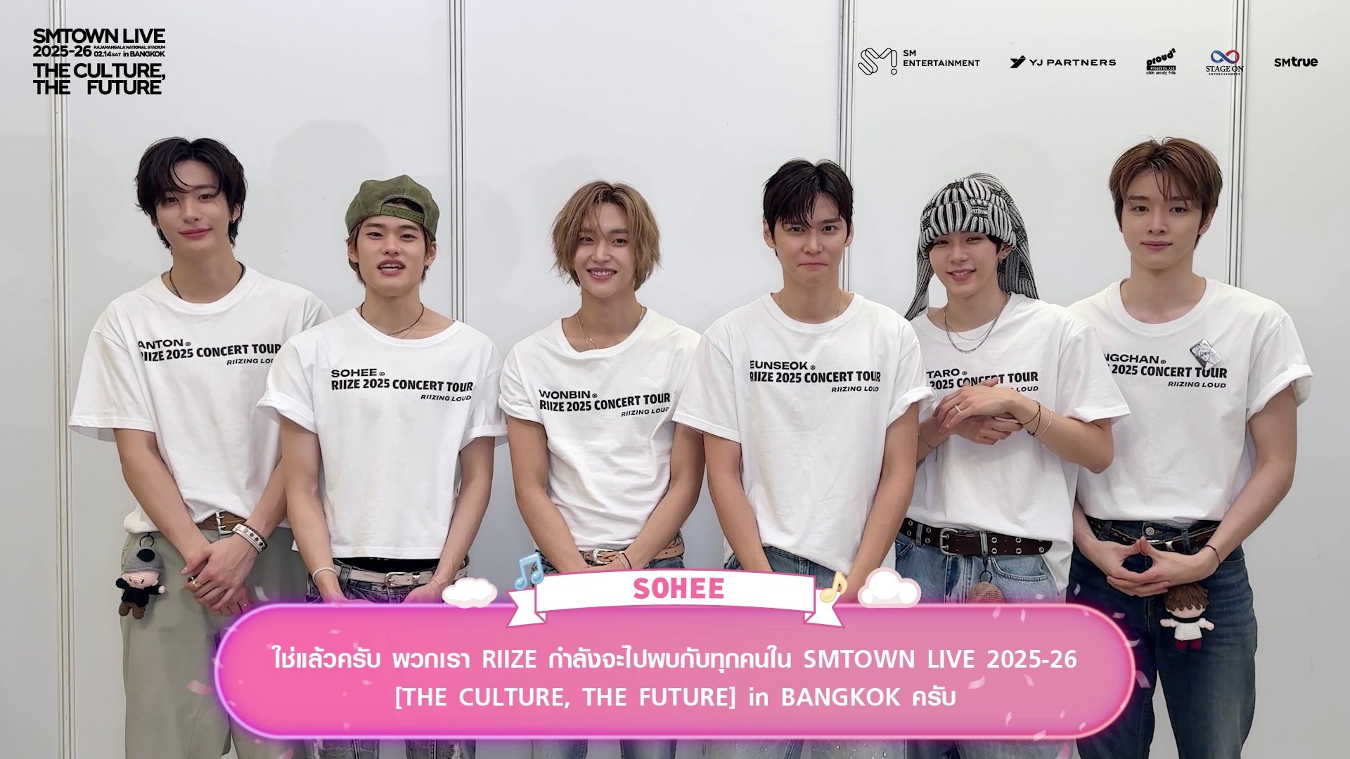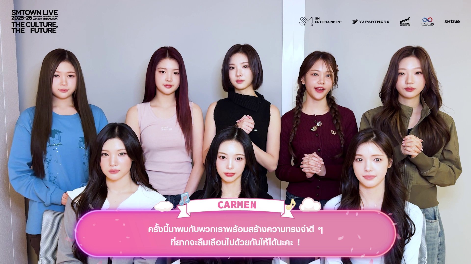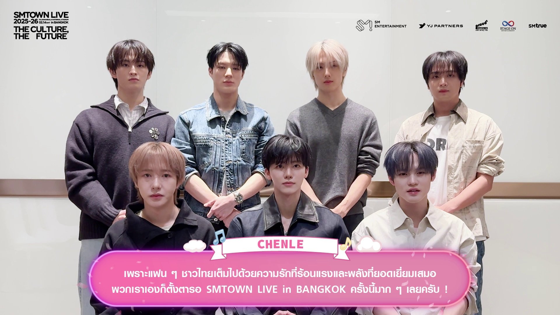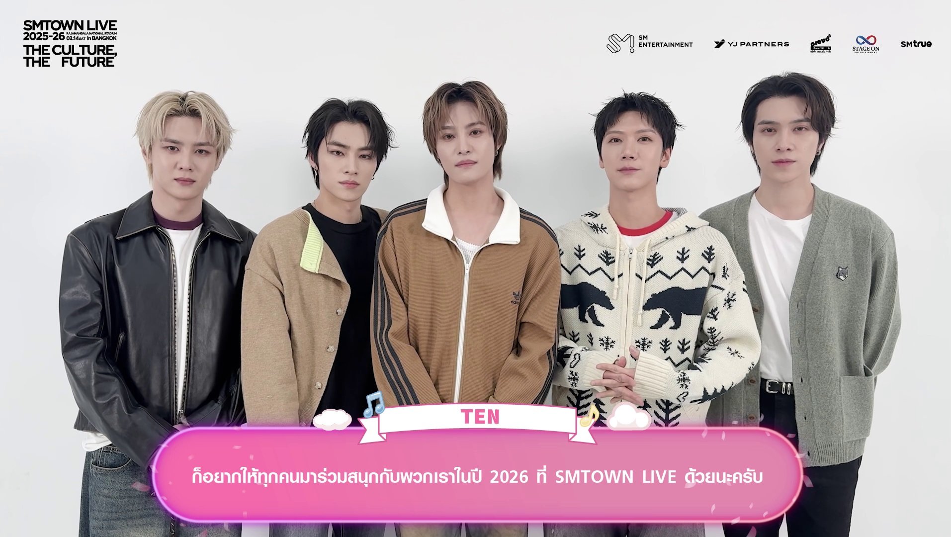 เหล่าศิลปินจากค่าย SM ENTERTAINMENT (เอสเอ็ม เอนเทอร์เทนเมนต์) ส่งความรักและคิดถึงมาทักทายแฟนคลับชาวไทย ยืนยันความพร้อมในการเดินทางมาสร้างความประทับใจครั้งยิ่งใหญ่ในคอนเสิร์ตระดับโลก ‘SMTOWN LIVE 2025-26 [THE CULTURE, THE FUTURE] in BANGKOK’ (เอสเอ็มทาวน์ ไลฟ์ ทูเธาซันด์ทเวนตี้ไฟว์-ทเวนตี้ซิกซ์ [เดอะ คัลเจอร์, เดอะ ฟิวเจอร์] อิน แบงค็อก) ซึ่งจะจัดขึ้นในวันเสาร์ที่ 14 กุมภาพันธ์ 2026 เวลา 18:00 น. ณ ราชมังคลากีฬาสถาน สเตเดียมที่ใหญ่ที่สุดในประเทศไทย