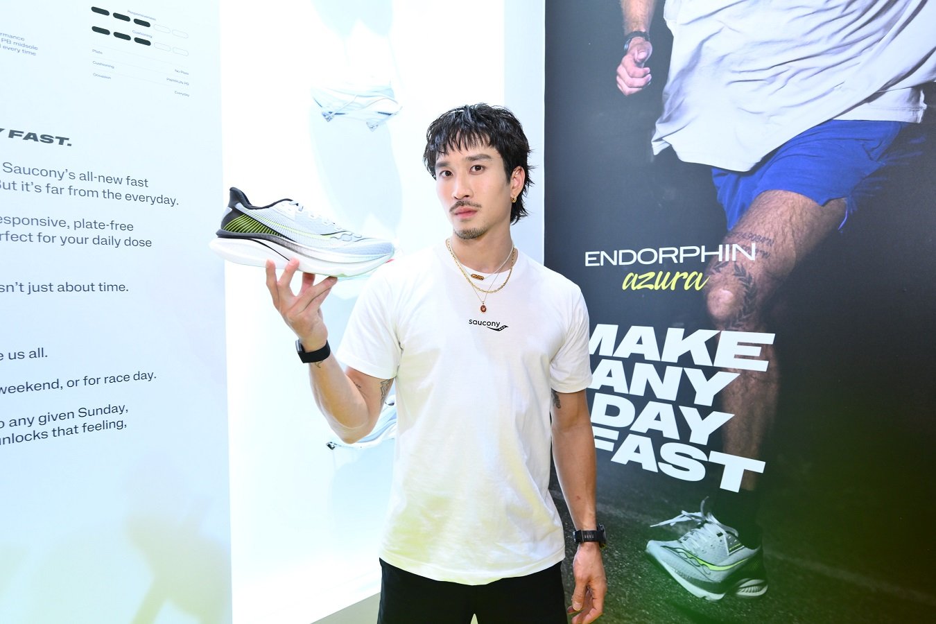 และในโอกาสพิเศษนี้ Saucony ยังได้แนะนำผลิตภัณฑ์เรือธงล่าสุด Endorphin Azura รองเท้าในกลุ่ม Fast & Light ที่มาแรงที่สุดในขณะนี้ โดยมีจุดเด่นอยู่ที่การนำ “ซูเปอร์โฟม PWRRUN PB” ซึ่งเป็นเทคโนโลยีระดับเดียวกับรองเท้าแข่งที่นักกีฬาระดับโลกใช้ มาปรับปรุงให้เข้ากับการซ้อมและการใช้งานประจำวัน ให้สัมผัสนุ่มเด้ง เบาสบาย แต่ยังคงการตอบสนองที่ฉับไว ตอกย้ำนิยามของคำว่า “Everyday Performance” ที่ใส่เที่ยวได้ ใส่ซ้อมดี และเป็นรองเท้าประเภท Vegan ที่เป็นมิตรต่อสิ่งแวดล้อมอีกด้วย