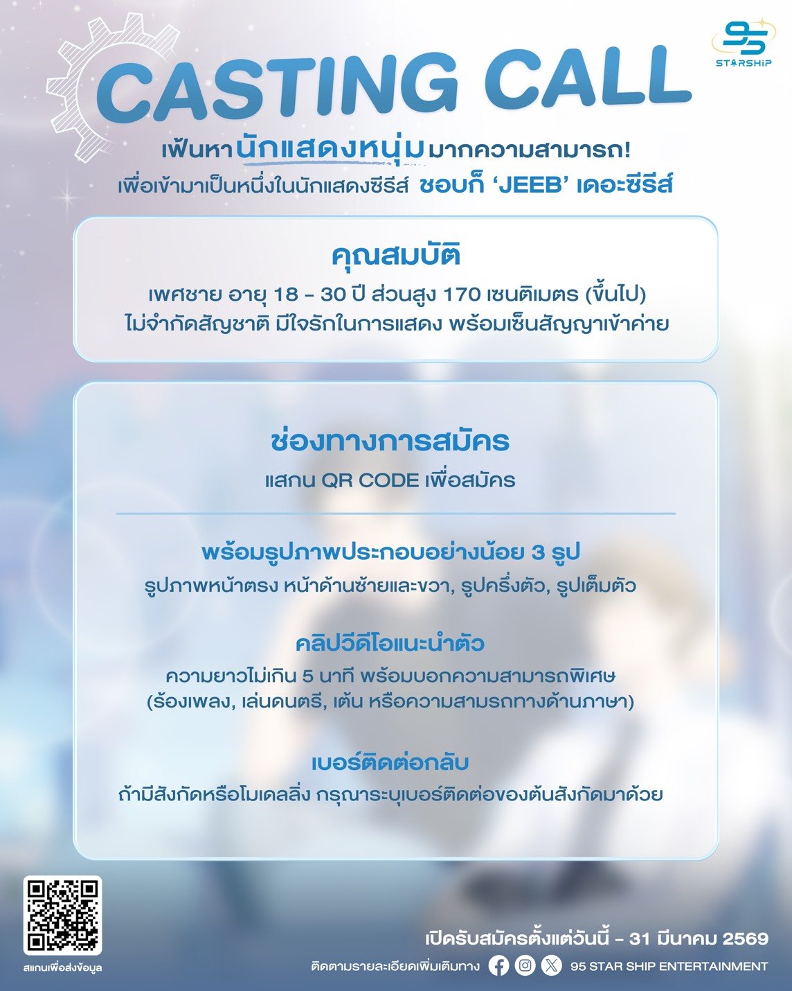บริษัท 95 Starship Entertainment ค่ายผู้ผลิตคอนเทนต์บันเทิงน้องใหม่ที่มุ่งพัฒนาผลงานซีรีส์ BL (Boys' Love) คุณภาพ เปิดโอกาสครั้งสำคัญสำหรับหนุ่มๆ ที่มีความฝันและความสามารถด้านการแสดง ด้วยการประกาศเปิดรับสมัครนักแสดงหน้าใหม่ เพื่อเข้าร่วมการคัดเลือกและรับบทในซีรีส์ "ชอบก็ Jeeb" กำกับการแสดงโดย "ลิท-ผดุง สมาจาร" ผู้กำกับที่มีผลงานโดดเด่นและได้รับความนิยมอย่างมาก โดยเฉพาะซีรีส์วายเรื่อง SOTUS The Series พี่ว้ากตัวร้ายกับนายปีหนึ่ง ซึ่งถือเป็นหนึ่งในซีรีส์วายที่ประสบความสำเร็จอย่างมาก เตรียมจะมาถ่ายทอดเรื่องราวความสนุกและเสน่ห์ของตัวละครผ่านผลงานซีรีส์ "ชอบก็ Jeeb"