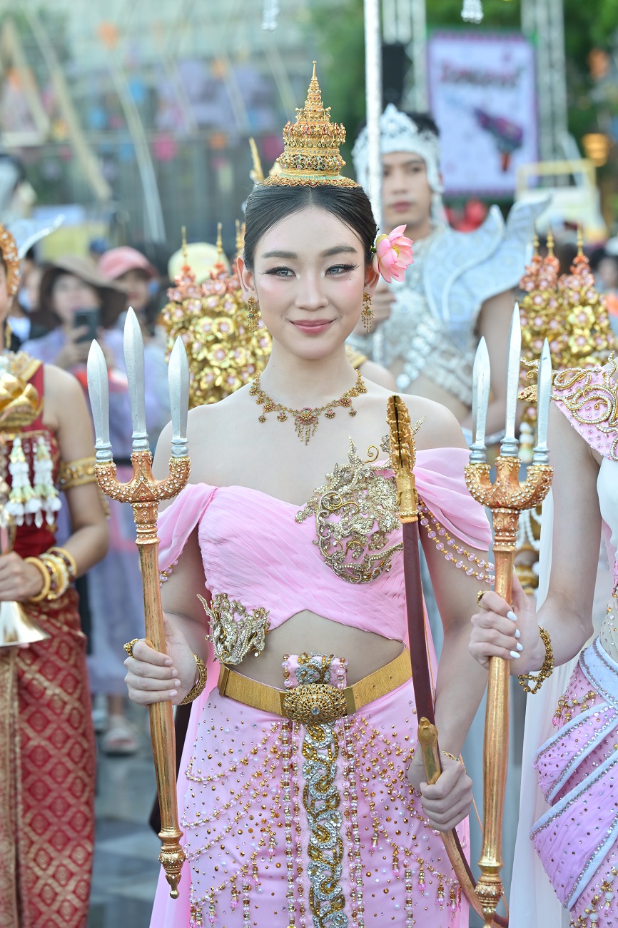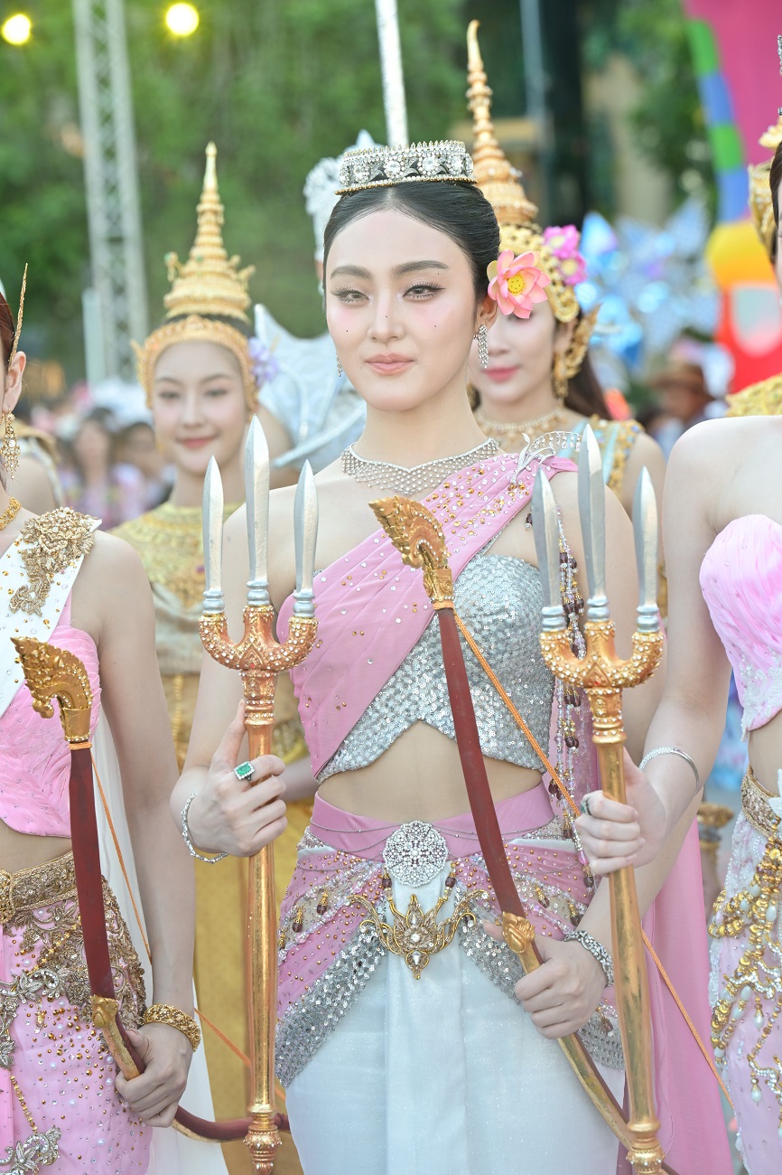 ทำเอาริเวอร์ พาร์ค ไอคอนสยาม เนืองแน่นไปด้วยเหล่าฟอร์อาย รวมถึงประชาชนและนักท่องเที่ยวที่ต่างมารอมารอยลโฉม 7 สาว แฮนน่า, อ๊ะอาย, ตาออม, พั้นช์, ฝ้าย, มายด์ และ โจริญ ซึ่งมาร่วมถ่ายทอดความงดงามของมรดกไทยในฐานะนางสงกรานต์ประจำปี 2569 “รากษสเทวี” ในขบวนแห่ฉลองวันสงกรานต์ โดยงานนี้ทั้ง 7 สาวสลัดลุคเกิร์ลกรุ๊ปสุดแซบ มาปรากฏกายในชุดเทพนารีสุดวิจิตร ผลงานชุดนี้ออกแบบโดย ดร.สุรัตน์ จงดา แห่งคณะไก่แก้วการละคร ผู้รังสรรค์ศิลป์เครื่องแต่งกายไทยร่วมสมัยชั้นนำของประเทศไทย ด้วยประสบการณ์และความเชี่ยวชาญด้านศิลปะการแสดงและเครื่องแต่งกายไทย ได้รับรางวัลการออกแบบเครื่องแต่งกายรางวัลนาฏราช ซีรีส์เรื่องแม่หยัว และดร.เจษฏากรณ์ เอี่ยมอุไร ห้องเสื้อรามลักษณ์ เคยออกแบบชุดประจำชาติเวทีมิสแกรนด์ ได้ถ่ายทอดความงดงามทางวัฒนธรรมผ่านผลงานที่วิจิตรตระการตาทรงคุณค่า โดยออกแบบชุดนางสงกรานต์ภายใต้คอนเซปต์ชุดไทยประยุกต์ตัดเย็บแบบ Haute Couture ในโทนสีชมพูออยล์ (Pink Oil) ผสานผ้ายกทองลวดลายโบราณและเครื่องประดับล้ำค่า โดดเด่นเป็นสง่าท่ามกลางขบวนแห่นางสงกรานต์สุดอลังการ ที่ผสานความขลังของคติความเชื่อไทยเข้ากับพลังของศิลปินยุคใหม่ได้อย่างลงตัว